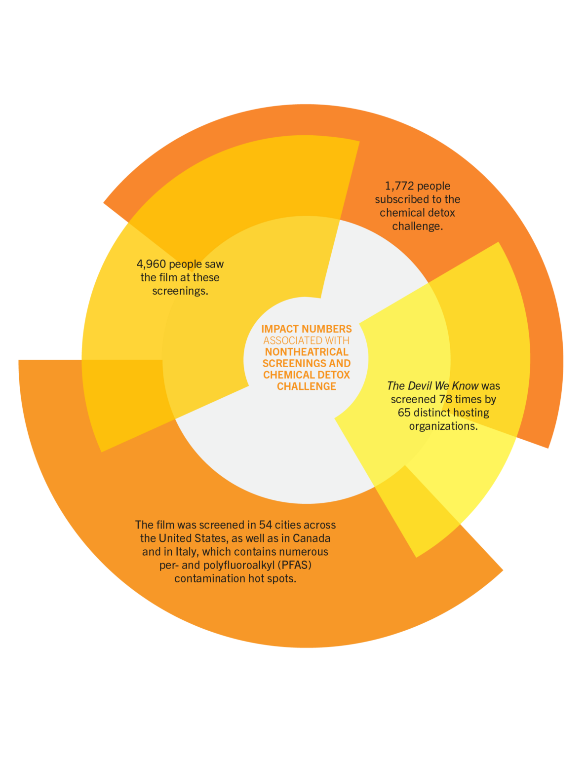 Through the nontheatrical screening campaign with Film Sprout, The Devil We Know was screened 78 times by 65 distinct hosting organizations, such as the NRDC, Lululemon, Carolina Nature Coalition, New York Water Project, and the Sierra Club. Approximately 4,960 people saw the film at these screenings. The film was screened in 54 cities across the United States, as well as in Canada and in Italy, which contains numerous PFAS contamination hot spots.
