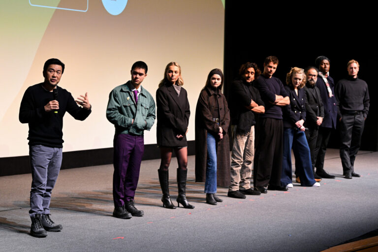 (L–R) Director Justin Lin with his cast and producers at Eccles Theatre for the premiere of “Last Days” in Park City. (Photo by George Pimentel/Shutterstock