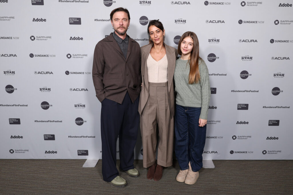 (L–R) Christos Passalis, Myrsini Aristidou, and Maria Petrova attend the “HOLD ONTO ME (Κράτα Με)” premiere during the 2026 Sundance Film Festival at Library Center