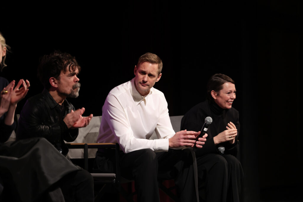 (L-R) Peter Dinklage, Alexander Skarsgård, and Olivia Colman attend the Q&A for Wicker by Eleanor Wilson and Alex Huston Fischer, an official selection of the 2026 Sundance