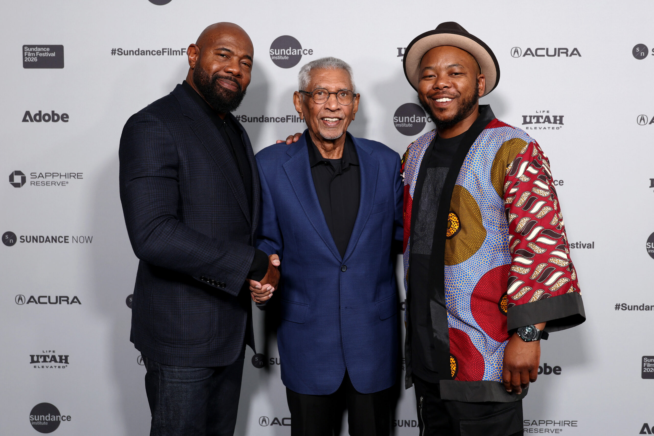 (L-R) Antoine Fuqua, Mac Maharaj and Thabang Lehobye attend the “Troublemaker” Premiere during the 2026 Sundance Film Festival at The Yarrow Theatre on January 27,